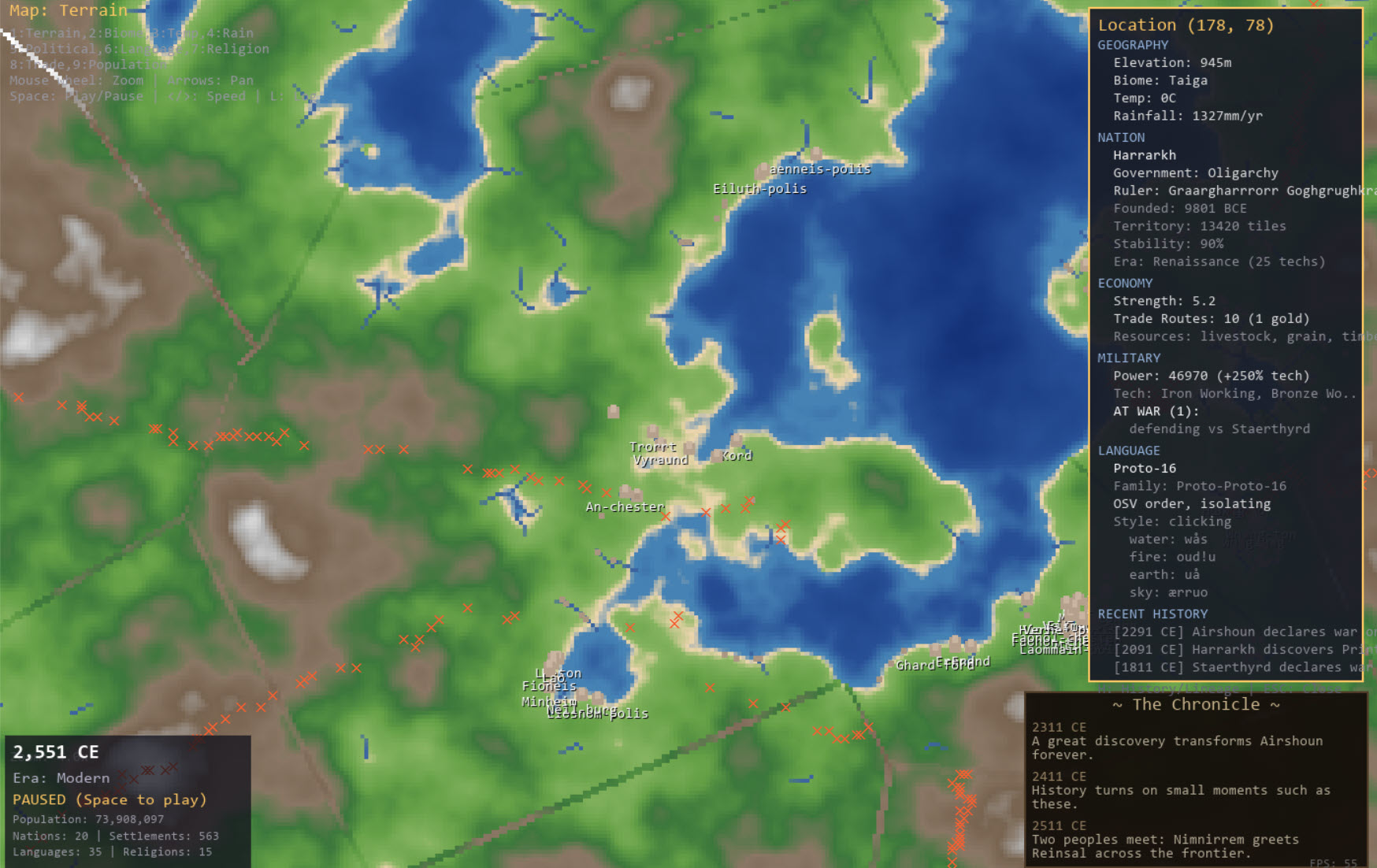 - Higher simulation speeds (32x+) work best for watching long-term history unfold